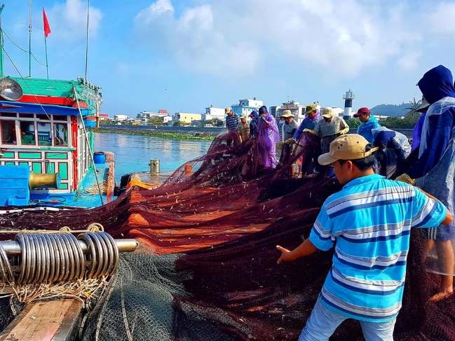 Một buổi sáng ngày mưa, ngư dân kéo lưới trên đảo Bé. Ảnh: Khương Trần.