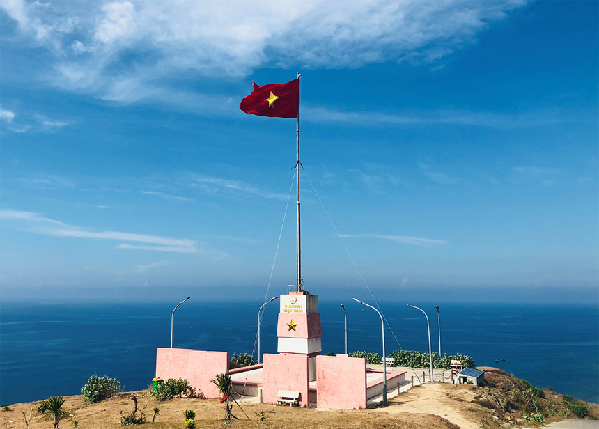 Bên cạnh đó, bạn cũng tham quan công trình Cột cờ Tổ quốc đứng sừng sững trên đỉnh Thới Lới có chiều cao 20 m mặt hướng ra quần đảo Hoàng Sa. Ảnh: Hoàng Yến.