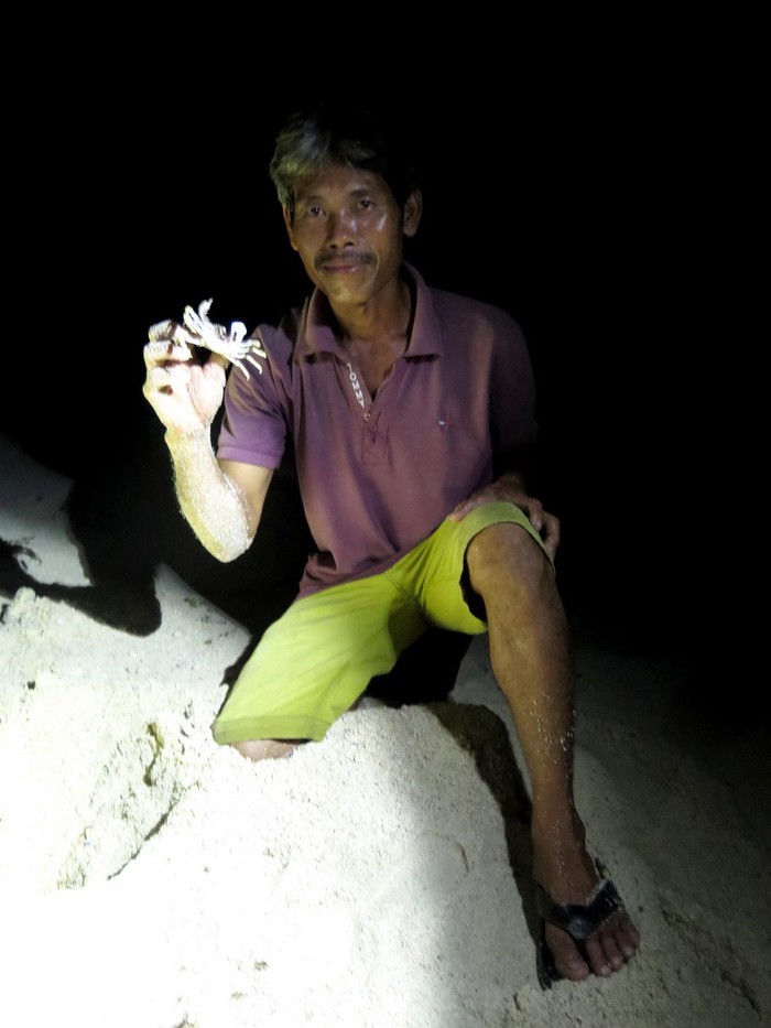Khi màn đêm buông xuống bao trùm lấy hòn đảo xinh đẹp cũng là lúc du khách được dịp theo chân dân bản địa đi săn cua đá. Dụng cụ đơn giản chỉ là đèn pin và thùng nhựa đựng cua.